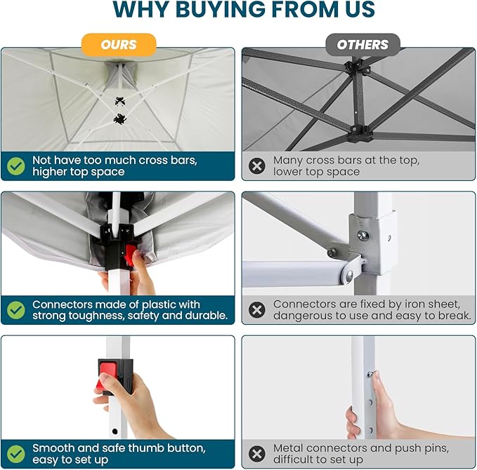 • Easy Setup and Storage: Adjustable to three heights—114 inches, 118 inches, and 122 inches—10 x 10 pop up canopy tent can be set up by 1-2 people without tools. Detailed installation videos and instructions are provided. Contact us if you encounter any issues during setup.