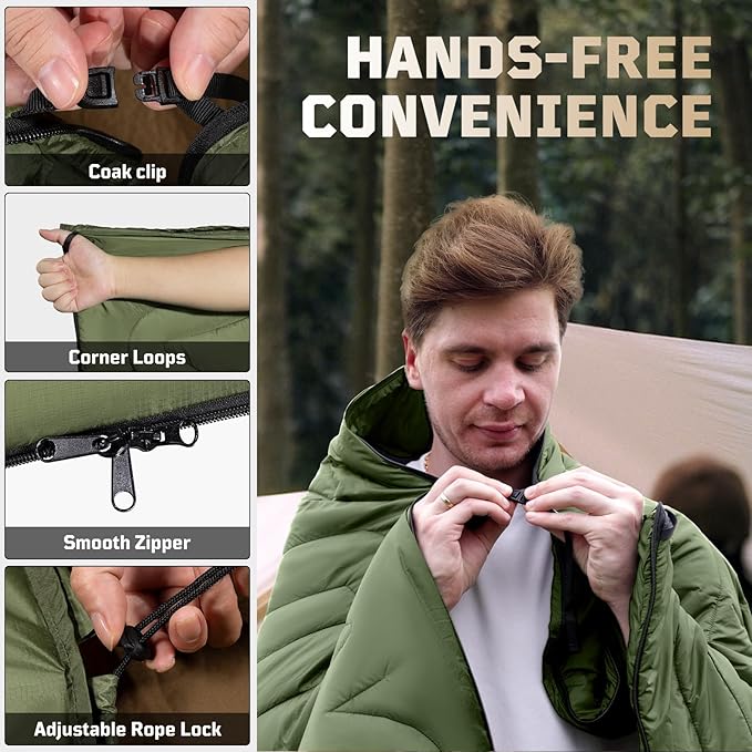 • Versatile Design: Transform this multifunctional blanket into a quilt, poncho, temporary sleeping bag, or mat. An adjustable drawstring creates a footbox for personalized warmth and breathability, while four corner loops secure it to the ground—perfect for picnics. Adapt it to your needs, whether camping, hiking, or relaxing at home
