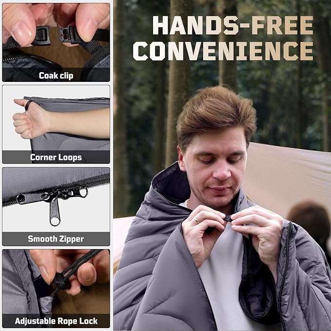 • Versatile Design: Transform this multifunctional blanket into a quilt, poncho, temporary sleeping bag, or mat. An adjustable drawstring creates a footbox for personalized warmth and breathability, while four corner loops secure it to the ground—perfect for picnics. Adapt it to your needs, whether camping, hiking, or relaxing at home