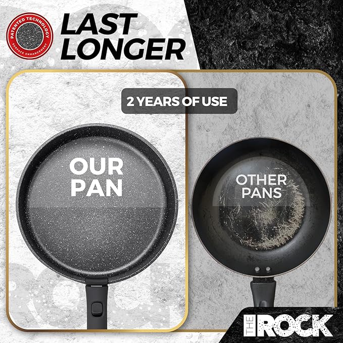 • 3x More Durable: The Patented Rock.Tec manufacturing process strengthens the surface of the cookware creating an ultra-hard, rock-like surface. The result is an outstanding release performance, 3x better than the standard non-stick cookware