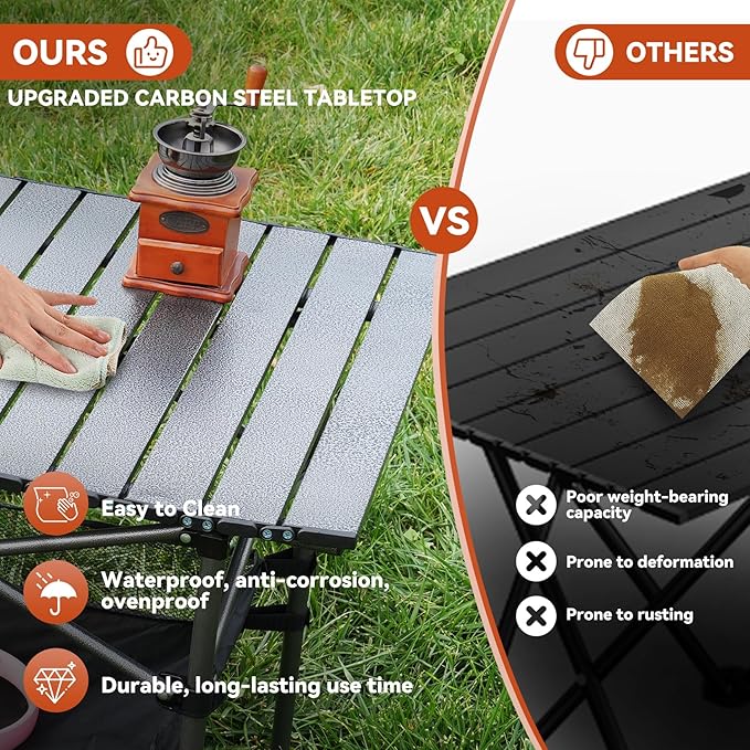 • UNMATCHED DURABILITY & STABILITY: Engineered with a top-notch upgraded carbon steel tabletop for lightweight portability, this camping table boasts unparalleled durability. Its robust steel pipe legs are structured in an X-frame design to maximize stability, confidently supporting up to an impressive 260 pounds of weight, ensuring a reliable and sturdy surface for all your outdoor activities.