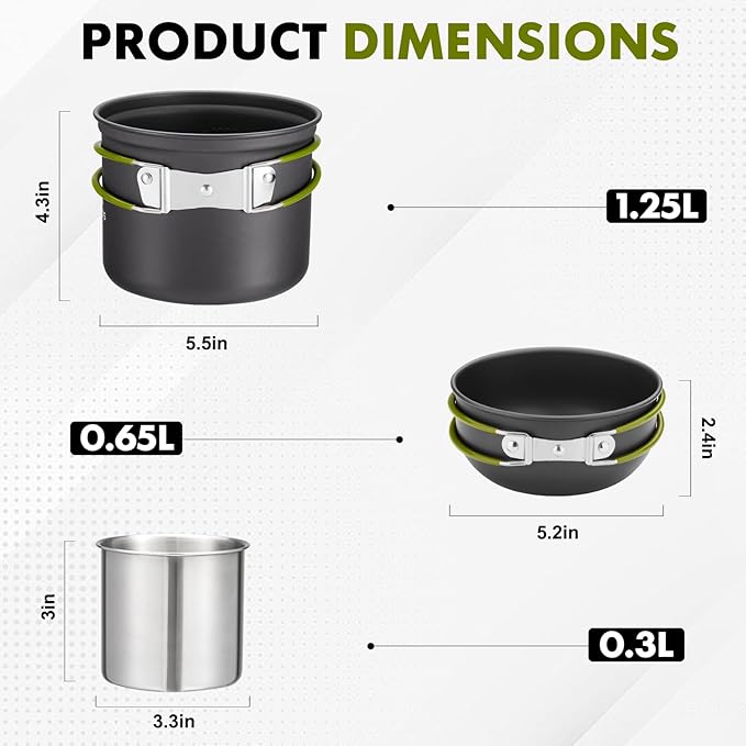 • Durable and Lightweight - With hard anodized aluminum and stainless steel construction, the camping set are the perfect balance of lightweight and long lasting outdoor cookware.