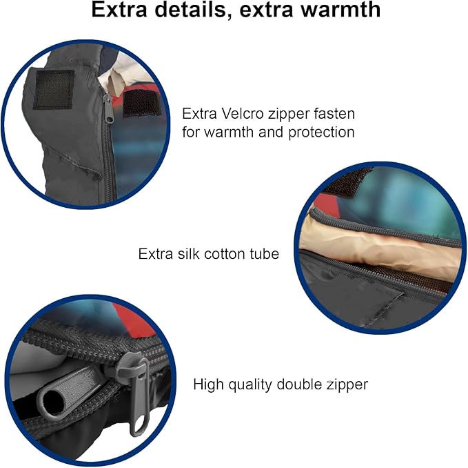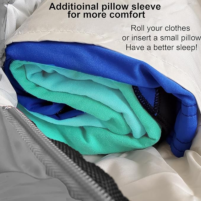 • A 3-4 SEASON CAMPING SLEEPING BAG (32-59 °F): Unlike other thin sleeping bags, from every step of the design, we kept warmth in mind for our young campers. The mummy style shape reduces unnecessary empty space to keep heat inside. Moreover, the extra draft tube, extra zipper snap, and cozy hoodie all help to keep our customers sleep sound and warm.