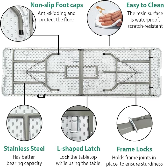 • 【Heavy Duty Table Top】The JingPieCle high-quality HDPE table top can bear 309 lbs,it is 20% thicker than other cheap 8 foot folding tables. the table top is waterproof and stain-proof, you can easily wipe it clean.