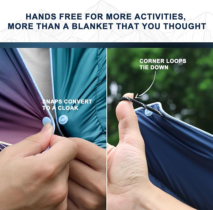 • 1.Functional Designs: The poncho snaps design could transform the puffy blanket into a cloak and make your hands available while you are drinking, eating, chatting or doing some campsite tasks and still keep you cozy. Buttoning up the snaps makes the soft blanket be a simple sleeping bag; two blankets can also be connected as a larger sleeping bag. Loops at the four corners allow you to stake the camping blanket into the ground and you can use it as a picnic mat and lie down