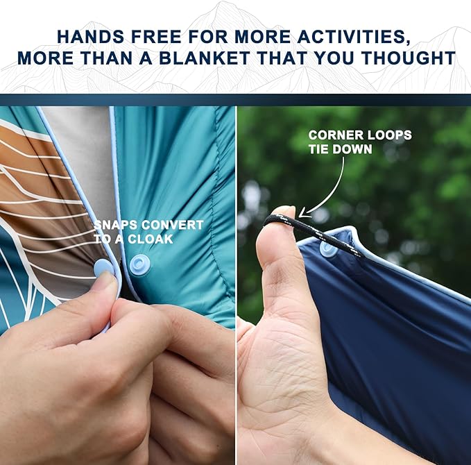 • 1.Functional Designs: The poncho snaps design could transform the puffy blanket into a cloak and make your hands available while you are drinking, eating, chatting or doing some campsite tasks and still keep you cozy. Buttoning up the snaps makes the soft blanket be a simple sleeping bag; two blankets can also be connected as a larger sleeping bag. Loops at the four corners allow you to stake the camping blanket into the ground and you can use it as a picnic mat and lie down