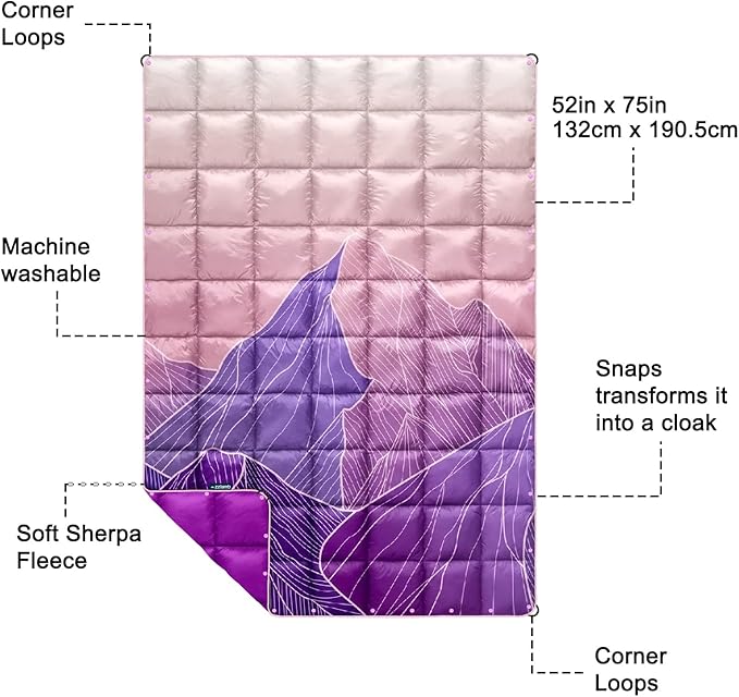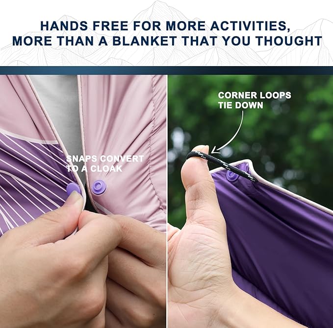 • 1.Functional Designs: The poncho snaps design could transform the puffy blanket into a cloak and make your hands available while you are drinking, eating, chatting or doing some campsite tasks and still keep you cozy. Buttoning up the snaps makes the soft blanket be a simple sleeping bag; two blankets can also be connected as a larger sleeping bag. Loops at the four corners allow you to stake the camping blanket into the ground and you can use it as a picnic mat and lie down