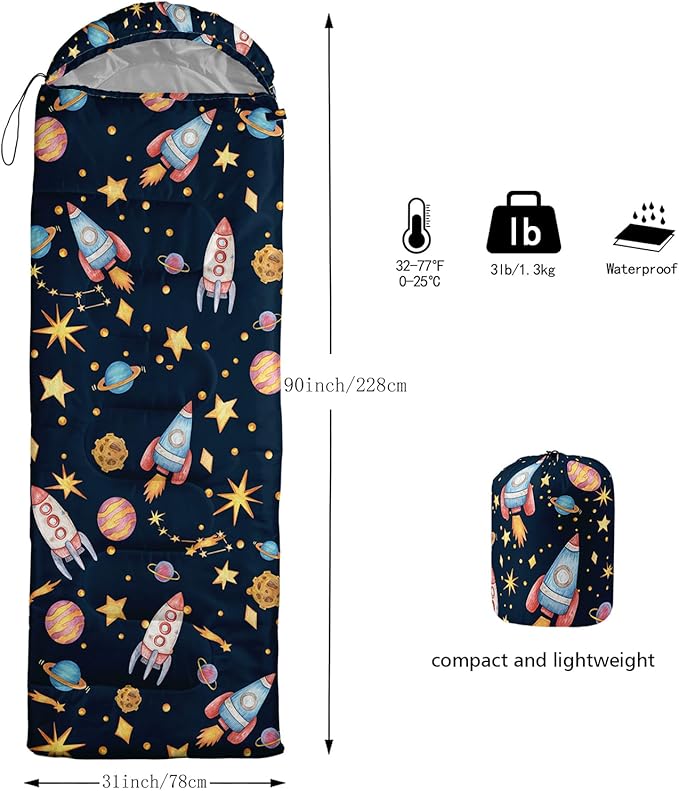 • 【Fits For 3 Seasons】: Size - 31 by 90 inches (W x D). Our Rocket sleeping bag can be used in 3 seasons with a design temperature of 32℉-77℉(0℃-25℃)