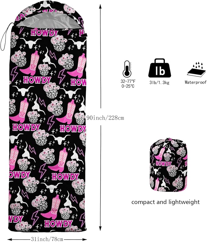 • 【Fits For 3 Seasons】: Size - 31 by 90 inches (W x D). Our Disco Glint sleeping bag can be used in 3 seasons with a design temperature of 32℉-77℉(0℃-25℃)