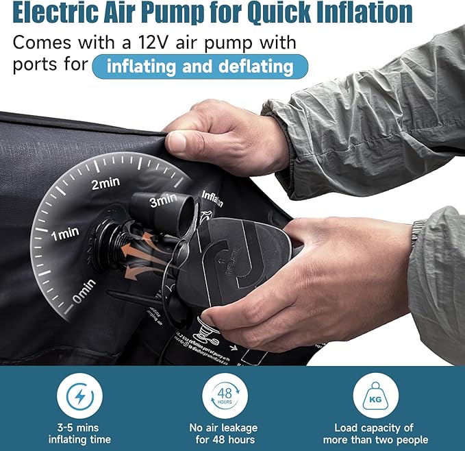 • FAST INFLATION AND DEFLATION: Equipped with car power fast charging electric pump for air mattress, quickly inflate or deflate through different ports, 12 volt DC power plug,Used to connect car power socket,Open exhaust valve,Press and discharge air,Double-layer air nozzle,let The air can only enter,And it can be inflated quickly and easily
