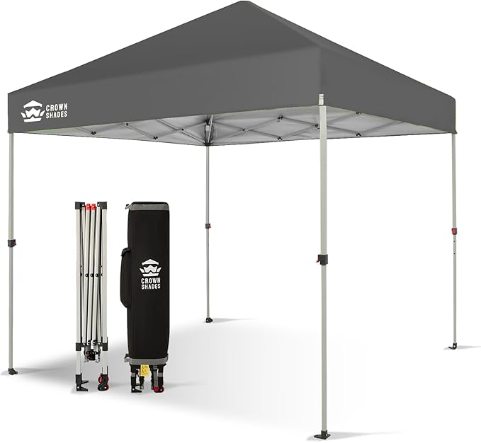 CROWN SHADES 8x8 Pop Up Canopy - Beach Tent with One Push Setup - Easy Outdoor Sun Shade for Events, Parties, Camping - Gazebo with STO-N-Go Cover Bag, Silver Coated Top,Grid Grey