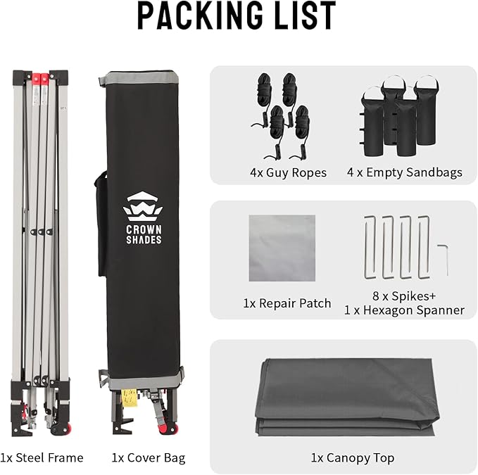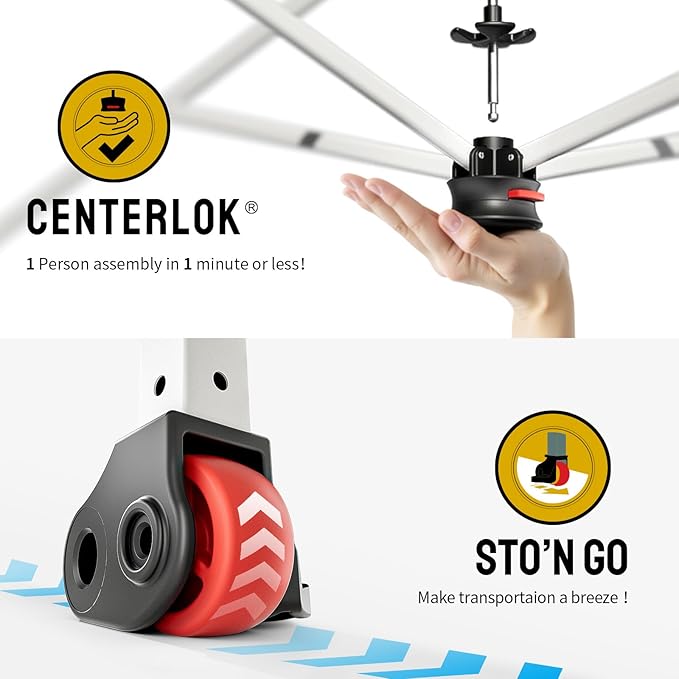 • STO’ N GO SYSTEM - Our lift-free system makes collapsing, storing, and transporting the 8x8 tent a breeze. The 8x8 tents can be stored with the fabric attached, with a specialized pocket for 4 sandbags, 8 stakes, and 4 guy ropes. Integrated wheels in the feet allow easy movement even when the instant shelter tent is set up, by simply lifting the side without wheels. This feature is especially useful for quick setup and takedown at locations like the patio or sports events