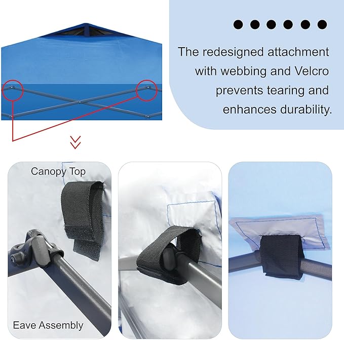 • HIGH GRADE STEEL FRAME - The durable, high-grade, corrosion-resistant steel truss frame with hardened through bolts comes pre-assembled and can be set up without any tools. Engineered to support up to 120 lbs. distributed across the frame, it ensures robust and reliable performance. The extended ceiling assembly and upgraded high peak design make it easier for rainwater to run off, preventing water pooling on the canopy. Perfect for extended outdoor use at markets, festivals, and exhibitions.