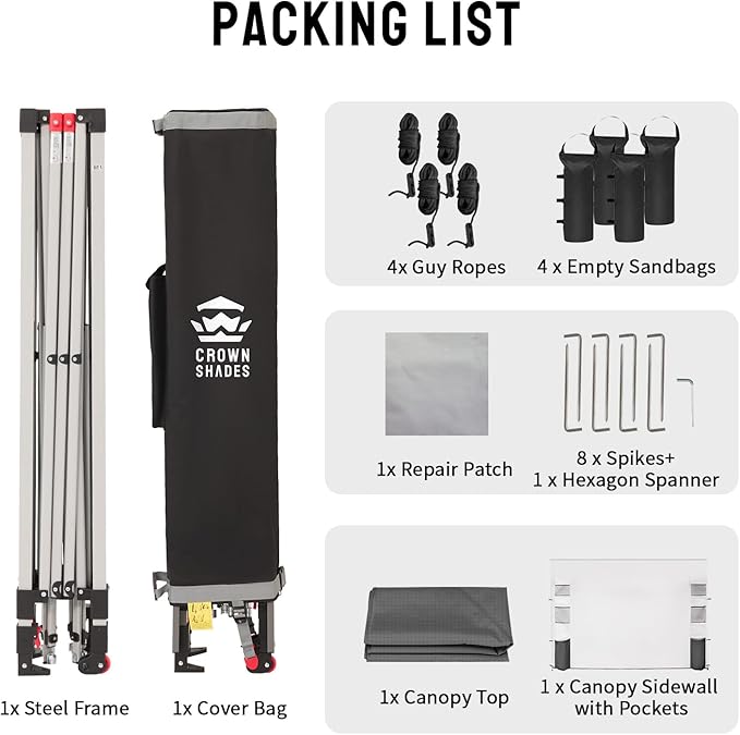 CROWN SHADES Canopy Tent 10x10 Pop Up Canopy Outdoor Shade with Pockets Sidewall, Easy Up Sun Shelter with One Person Set Up Center Lock, Portable Instant Camping Beach Canopies Tents, Grid Grey