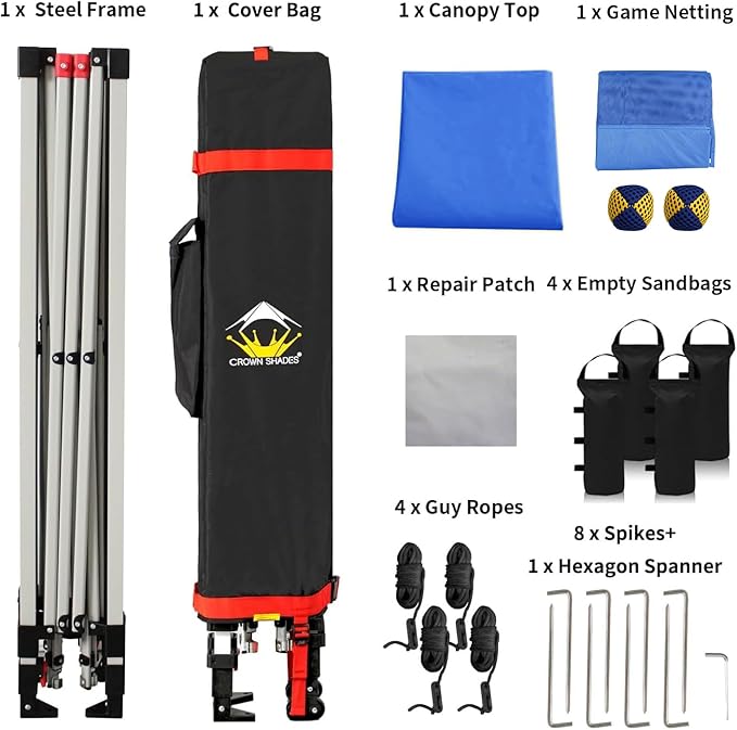 CROWN SHADES 10x10 Pop Up Canopy Tent with Game Netting - Beach Tent with One Push Setup - Outdoor Sun Shade for Events, Parties, Camping with STO-N-Go Cover Bag, Silver Coated Top, Blue