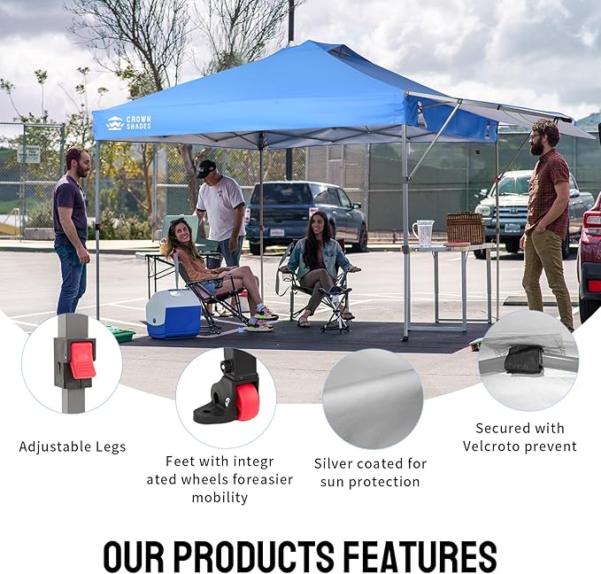 CROWN SHADES 10x10 Pop up Canopy Tent, Instant Commercial Canopy with Extend Awning, Patended Centerlock, 150D Silver Coated Fabric, 4 Ropes, 8 Stakes, 4 Weight Bags, STO 'N Go Bag, Blue
