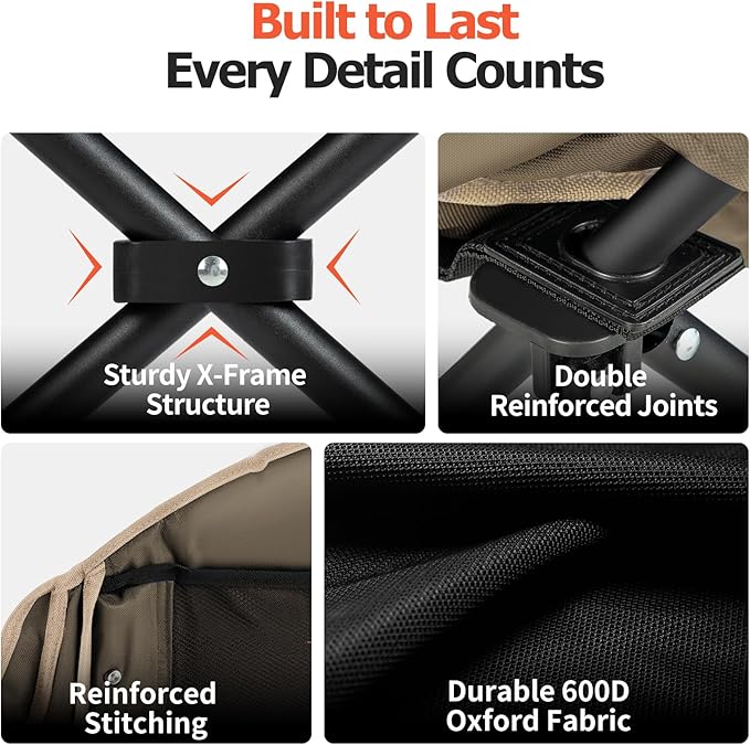 • Durable & Sturdy Construction: Built to last, our luxury camping chairs feature reinforced double-stitching in high-stress areas to prevent fraying. The chair legs are designed with an angled tilt for improved relaxation, providing a more comfortable experience compared to standard large camping chairs.