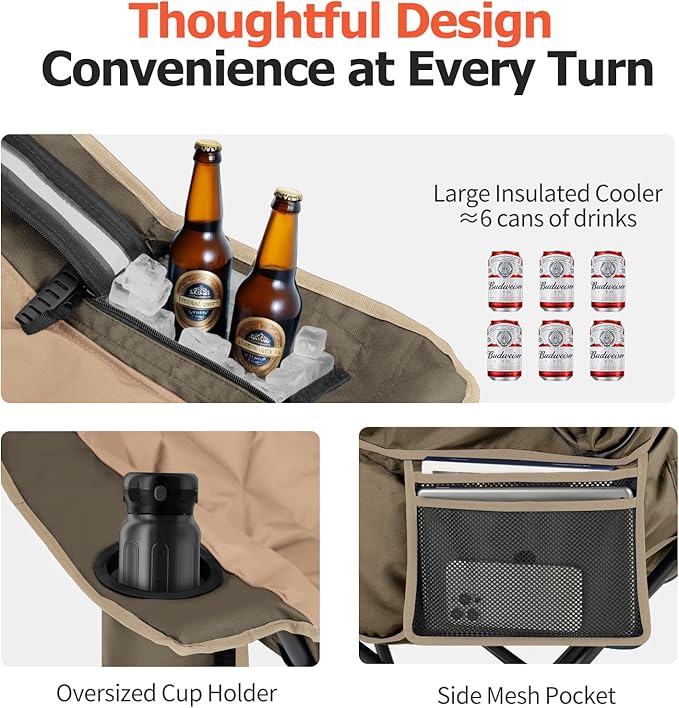 • Thoughtful Features for Convenience: Designed with the user in mind, Overmont camping chair includes an oversized cup holder that fits most beverage sizes and a large cooler bag for your favorite drinks. The side mesh pocket provides easy access to personal items, making it a versatile choice for comfy camping chairs for adults.