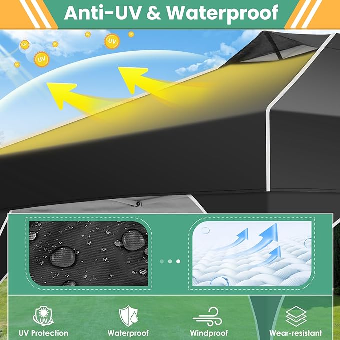 • 【Waterproof & UPF 50+ Protection】The 10x10 pop up canopy features premium 210D Oxford fabric that blocks 99% of harmful UV rays. This outdoor canopy tent provides reliable shade and waterproof protection with 2000mm water resistance. For longer lifespan, we recommend storing it when not in use.