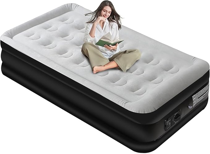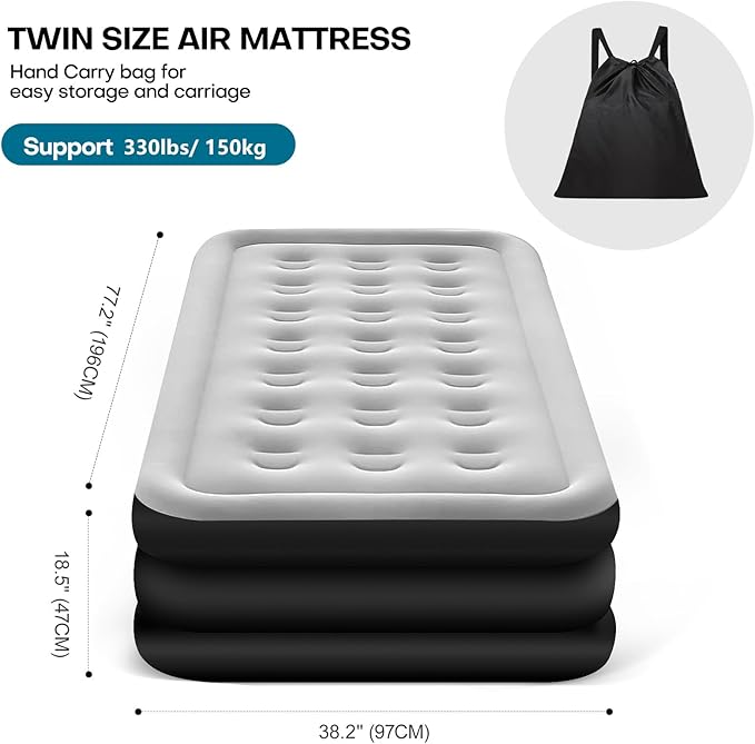 • 【 The Size of Twin AirBed 】 A meticulously designed 18.5" deep twin air mattress W 38.2" x L 77.2" x H 18.5". The mattress supports up to 330 lbs, ensuring durability and comfort for all users.