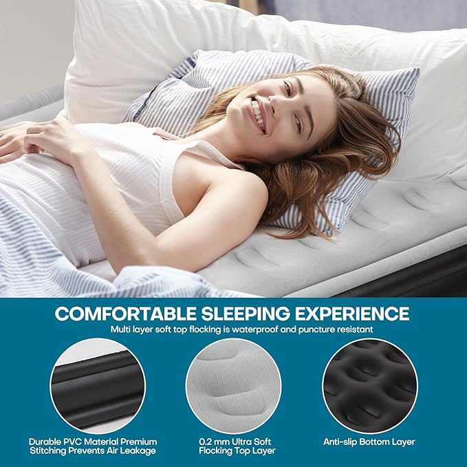 • 【 Durable, Puncture-Resistant Material 】 This extra-thick PVC air mattress is designed for long-lasting durability and puncture resistance, making it perfect for both indoor and outdoor use. The skin-friendly flocked surface ensures a comfortable sleep which the texture is really soft and bouncy