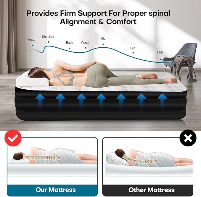 • 【 Full Body Support & Comfort 】Our inflatable bed features robust internal air coils, this inflatable bed provides excellent spinal support and helps maintain a firm and flat sleeping surface. The integrated raised pillow offers additional neck support, ensuring a restful night’s sleep for both adults and children.
