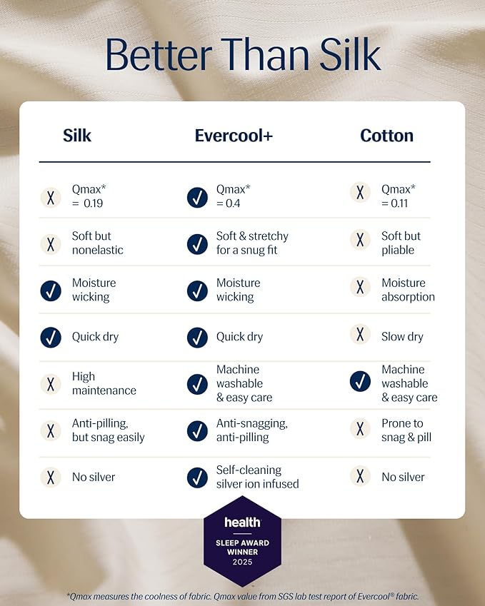 • Awarded Best Cooling Sheets: Evercool+ Three piece bed sheets set that’s cooler than cotton and linen; Engineered fabric for long-lasting coolness, moisture wicking and rapid heat dissipation; Enhance your bedding set along the cooling pillow, mattress topper and bed. Featured in 2023 “The Best List” by Apartment Therapy for best bedding, ideal for all seasons and hot sleepers with night sweats and hot flashes