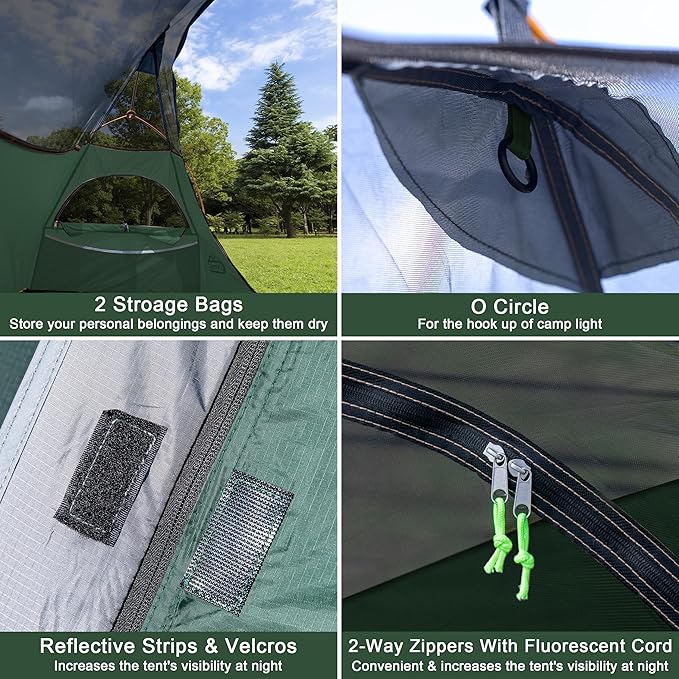 • 【Spacious & Comfortable Interior】Despite its compact size, this one man tent offers a spacious interior. With a unique pole design, it maximizes usable space at the top, ensuring comfort while you're inside. The inner tent measures 7.38ft x 3.14ft x 3.74ft, outer tent measures 8.26ft x 4.92ft x 4.1ft, providing plenty of room for personal gear. It's the perfect hiking tent for solo travelers who don’t want to compromise on comfort.