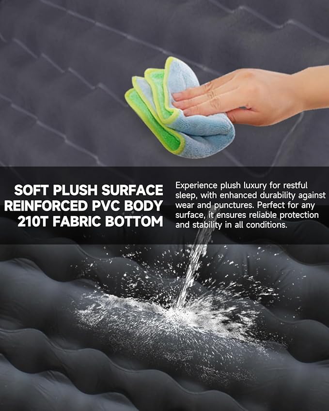 • Durable & Comfortable Design: Crafted from thickened PVC material, this air mattress delivers superior durability and leak-resistant performance for long-lasting use. The soft, plush velvet-like surface enhances comfort while maintaining its waterproof properties, making it ideal for both outdoor adventures and indoor relaxation. Enjoy a cozy and reliable sleeping experience wherever you go.