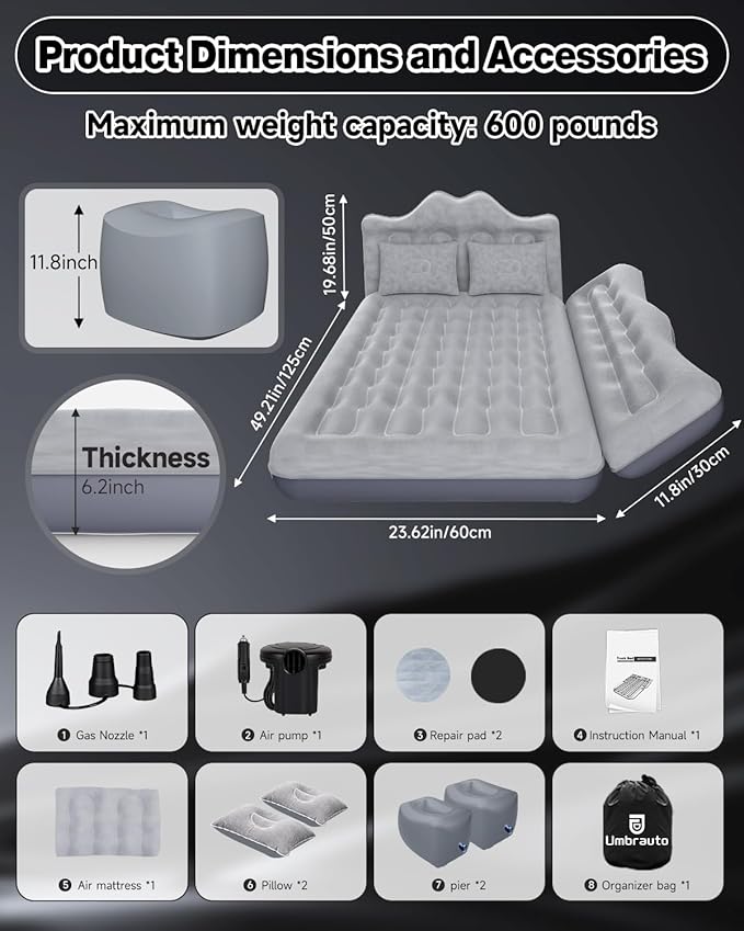• Heavy-Duty Support: Built to accommodate up to 600 pounds, this car camping air mattress offers a sturdy and spacious sleeping area for solo travelers or companions. Designed for durability and comfort, it ensures reliable support throughout your adventures, making every trip restful and worry-free.