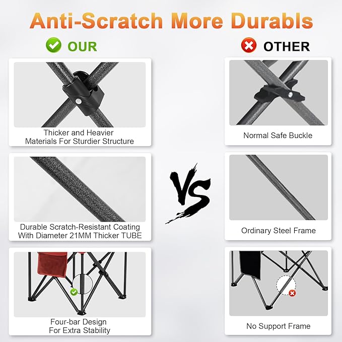 • Heavy Duty Camping Chair: Our Xl camping chair open dimension 24" L x 38.5" W x 42"H and it with more higher and more wider seat.This outdoor chair's the frame, coated with sturdy, scratch-resistant paint, is capable of supporting up to 500 lbs.Additionally, the non-slip textured feet provide a stable and secure seating experience