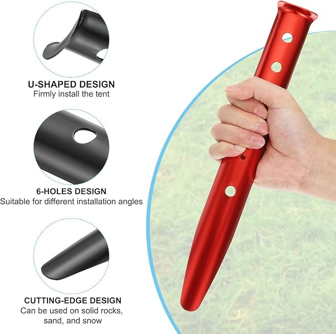 • Advantage: Tent stakes are made of aluminum alloy, which is lightweight, easy to carry and transport, can be put into a backpack or equipment bag, not easy to rust, corrosion-resistant, and durable. The stakes come with 6 holes, suitable for a variety of rigging.