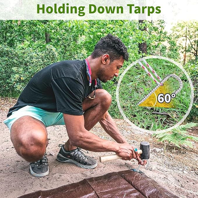 • 【Sharp Tips】The j hook stakes have a chiseled end to facilitate ground penetration, the metal steel is sturdy and does not deform when hammered into tough ground. These ground stakes are thick and heavy duty and they will not budge in a strong wind.
