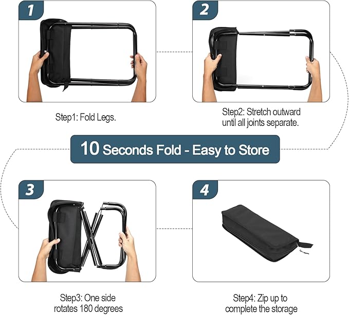 • Quick Folding and Setup: This folding camping stool sets up or folds down in seconds with no tools required. For any assembly issues, contact ous—our team will assist you within 12 hours
