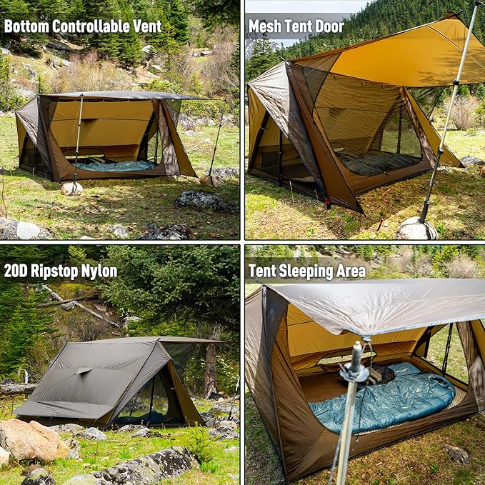POMOLY Bushcraft Shelter Trekking Pole Tent 20D Nylon Ripstop, STOVEHUT Ultralight Backpacking Tent with Porch for Camping Hiking