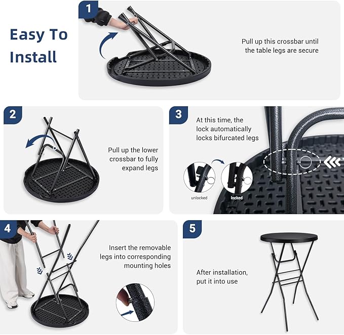 • EASY TO INSTALL: Our round cocktail table can be quickly installed in minutes. Fully pull up the legs attached to the tabletop, insert and lock the split legs in the form of combination rods. After completing, the pub table can be put into use