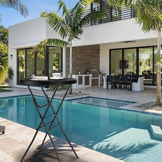 • SUITABLE USE SIZE: Single unfolded dimensions of this bar table: 28"(L) x 28"(W) x 43.3"(H); Single folded dimensions: 28"(L) x 28"(D); Two pack weight: 27.12 lbs. This plastic hightop table is portable to use