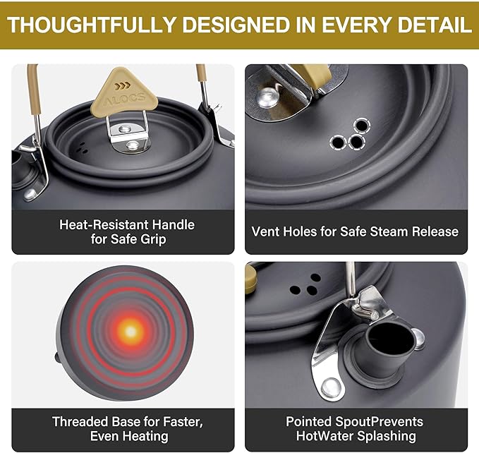 • ENJOY COFFEE ANYWHERE - This compact tea kettle is designed specifically for outdoor camping enthusiasts. Whether you're trekking, backpacking, camping, fishing, or picnicking, our professional-grade camping cookware is the ultimate wilderness essential.