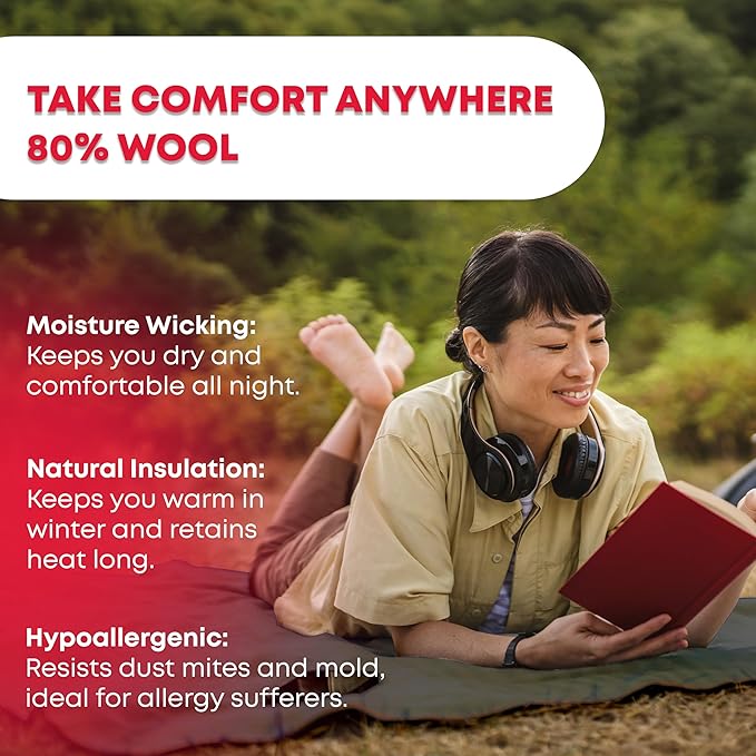 • NATURAL WARMTH & DURABILITY: Crafted from 80% wool, this time-tested material will keep you warm even when damp. The remaining 20% comprises hypoallergenic synthetic fibers, enhancing durability and washability while reducing shedding, ensuring your blanket lasts for years.
