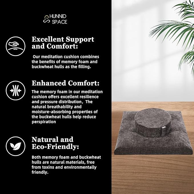 • ⚡ DUAL-LAYERED SUPPORT SYSTEM | DESIGNED TO LAST ▪️ Meditation Pillow: 16" x 5" | 100% natural buckwheat hulls for adjustable firmness ▪️ Meditation Mat: 32" x 3" | High-density shredded memory foam rebounds instantly → Never flattens! Retains shape for years with daily use.
