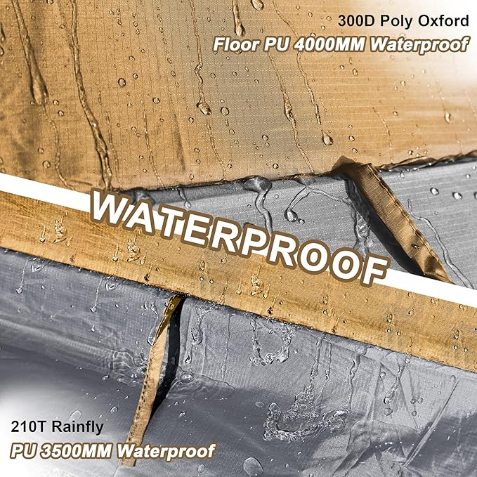 • 【Superior Waterproof Protection】Stay dry and comfortable no matter the weather with our 2 person backpacking tent. Crafted from high-quality materials, the 2 person tent features a 210T rainfly with a PU 3500MM waterproof rating and a 300D Poly Oxford floor with a PU 4000MM waterproof rating. This 4 season tent is fully field tested to withstand heavy rain, ensuring you remain protected from the elements during your camping trips.