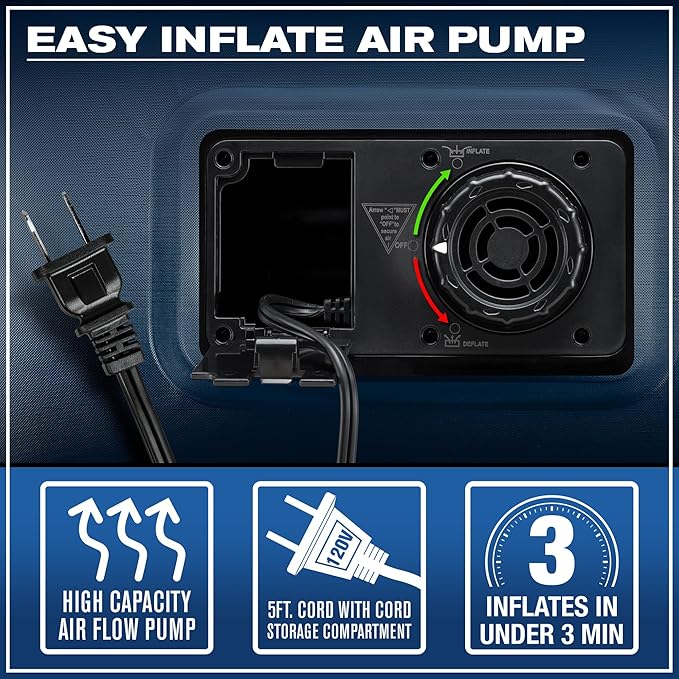 • Fast Inflation - Your queen air mattress with built in pump inflates in less than 3 minutes, you can discreetly pack the cord into the integrated storage compartment. Just remove from included carry bag, unfold, turn the fan on and watch the Air bed self inflate