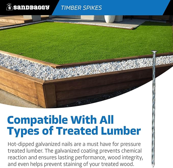 • HOT DIPPED GALVANIZED FOR 2X BETTER RUST PROTECTION! Sandbaggy's galvanized landscape timber spikes offer 2x the rust protection, able to withstand harsher weather conditions compared to common electro galvanized nails. Our nails meet ASTM A153 specifications for quality assurance.
