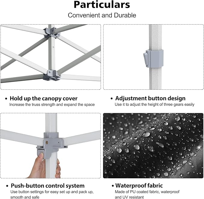 • 【Large Space】 10 x 20 Pop Up Canopy with straight legs provides a true 150 square feet shade. Big enough for about 8-15 people to sit under it. Height can be adjusted to 76in, 80in or 83in to meet your requirement. The peak height up to 135in. Suitable for market stalls, parties, picnics or any outdoor events.