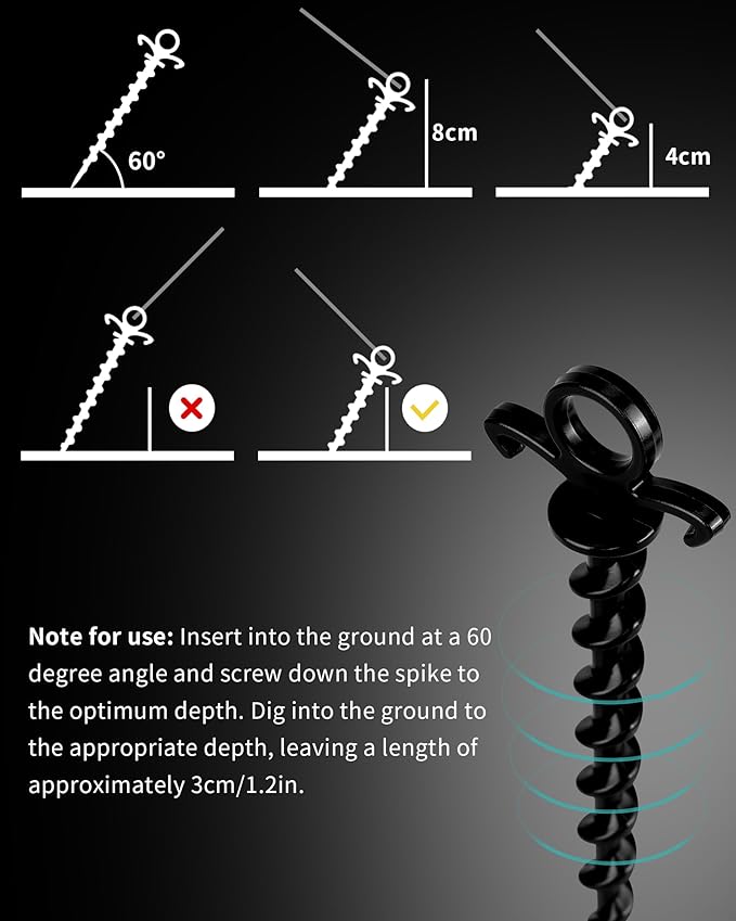 • Versatile for Different Locations: Our spiral stakes are versatile enough for use in gardens, campgrounds, sandy beaches, and uneven terrain. They perform exceptionally well in diverse conditions, providing reliable anchoring for tents and canopies. You can also use them to stabilize garden decorations or outdoor furniture, making them a practical choice for home use. No matter the location, these stakes ensure that your outdoor activities remain organized and secure