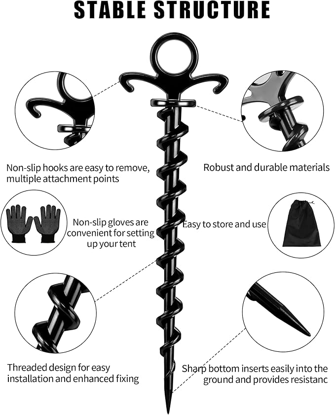 • Ideal for Various Outdoor Users: We designed our heavy-duty ABS spiral ground stakes to meet the needs of homeowners, campers, gardeners, outdoor enthusiasts, and beachgoers. These stakes are perfect for securing outdoor decorations and garden items, ensuring stability in various settings. Whether you’re at a campsite, hosting a family gathering, or decorating for a holiday, these stakes help keep your tents and equipment firmly anchored, preventing any movement during events