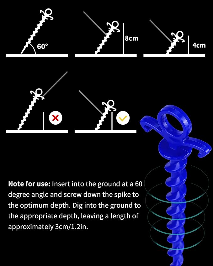 • Versatile for Different Locations: Our spiral stakes are versatile enough for use in gardens, campgrounds, sandy beaches, and uneven terrain. They perform exceptionally well in diverse conditions, providing reliable anchoring for tents and canopies. You can also use them to stabilize garden decorations or outdoor furniture, making them a practical choice for home use. No matter the location, these stakes ensure that your outdoor activities remain organized and secure