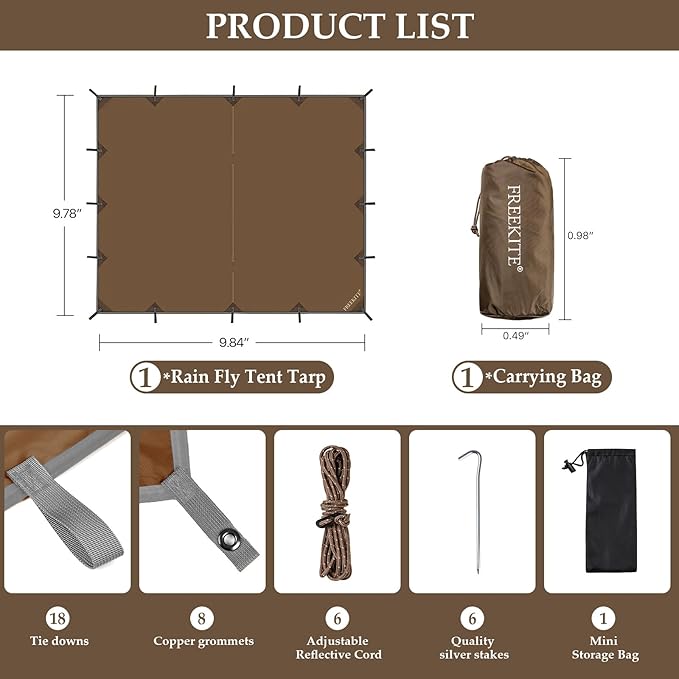 • Included Components : 18x Tie downs;8x Copper grommets;6x Quality silver stakes;6x Adjustable Reflective Cord;1x Rain Fly Tent Tarp;1x Carrying Bag;1x Mini Storage Bag 18x Tie downs;8x Copper grommets;6x Quality silver stakes;6x Adjustable Reflective Cord;1x Rain Fly Tent Tarp;1x Carrying Bag;1x Mini Storage Bag