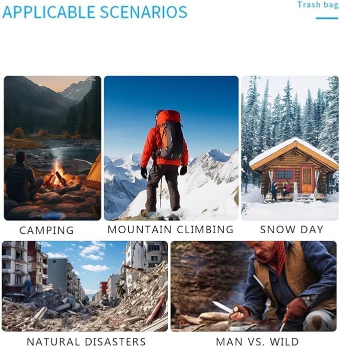 • 【Multi-Functional Survival Gear】: Beyond acting as a sleeping bag, the Emergency Sleeping Bag can be used as a bivy blanket, rain poncho, tent footprint, wind blocker, or even to collect water or melt snow. Its versatility makes it a valuable tool for outdoor survival and disaster preparedness.