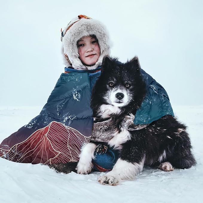 • 2.Functional Designs: The poncho snaps design could transform the puffy blanket into a cloak and make your hands available while you are drinking, eating, chatting or doing some campsite tasks and still keep you cozy. Buttoning up the snaps makes the soft blanket be a simple sleeping bag; two blankets can also be connected as a larger sleeping bag. Loops at the four corners allow you to stake the camping blanket into the ground and you can use it as a picnic mat and lie down